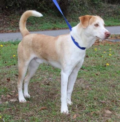 Stomper is a 1-year-old male Lab mix who has already been neutered. He was found at a local mobile home park and no owner came to claim him.ย Stomper has a tan coat with white markings; and his eyes are gorgeous.ย This handsome boy weighs 37 pounds so he is considered to be a medium size dog.ย Stomper is quite a character.ย He prances like a show pony–he is quite the high stepper!ย Stomper keeps our staff entertained with his antics.ย He would be good with other dogs and children; but he would NOT be good with cats. This dashing young dog is going to fill some adopter’s life with fun!ย By the way, Stomper is extremely curious and keeps an eye and an ear on everything going on around him!