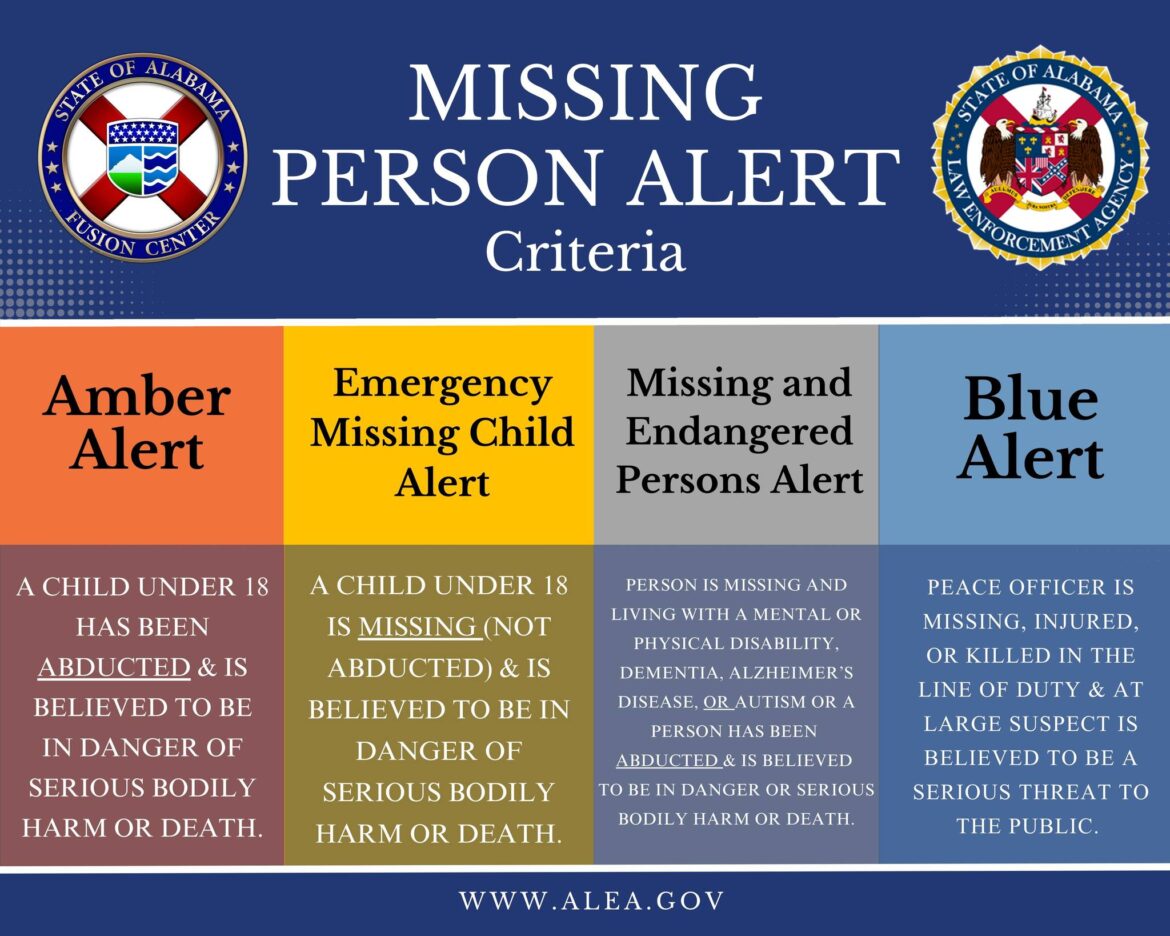 1. AMBER Alert – Issued when a child under the age of 18 has been abducted and is believed to be in immediate danger of serious bodily harm or death. Alabama follows the U.S. Department of Justice’s recommended AMBER Alert guidelines. Due to the strict criteria, AMBER Alerts are rare but highly targeted.