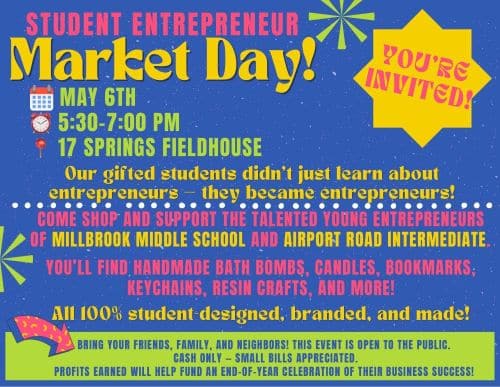 Young entrepreneurs are preparing to open their doors to the community, as gifted students from Millbrook Middle School and Airport Road Intermediate School turn months of creativity, problem-solving, and determination into real businesses for the upcoming Student Entrepreneur Market Day.