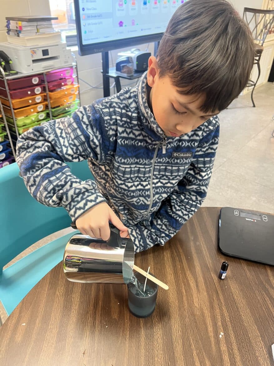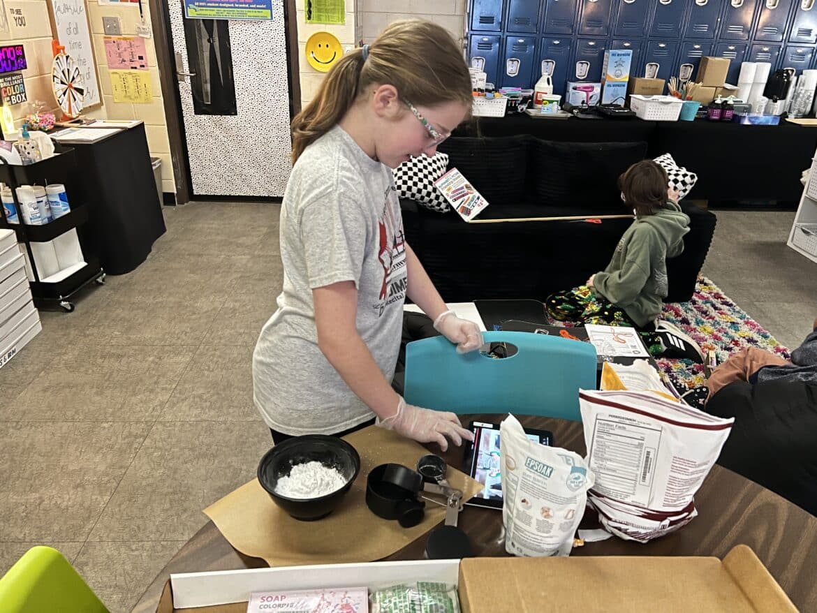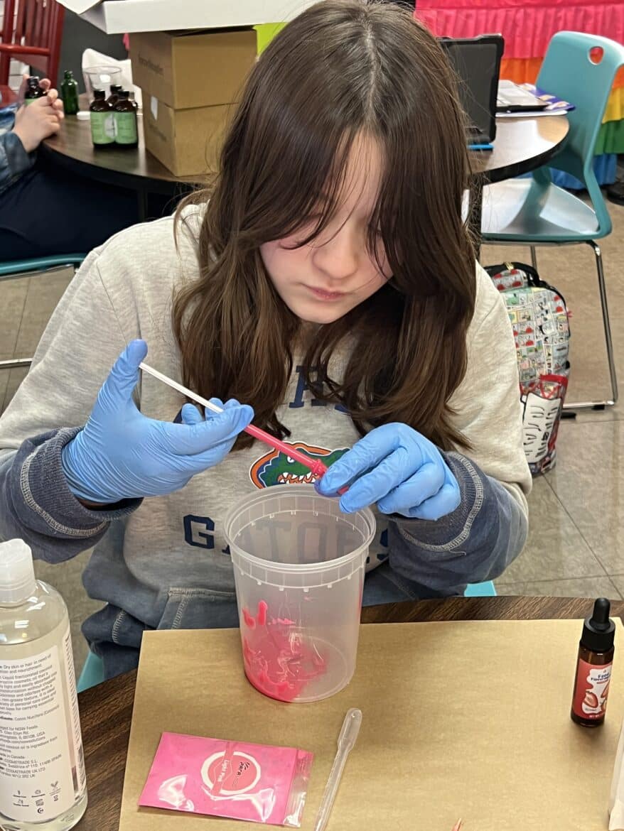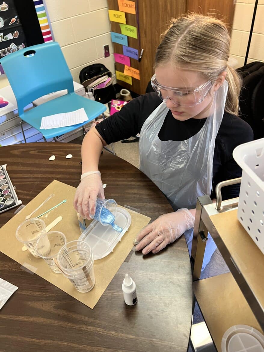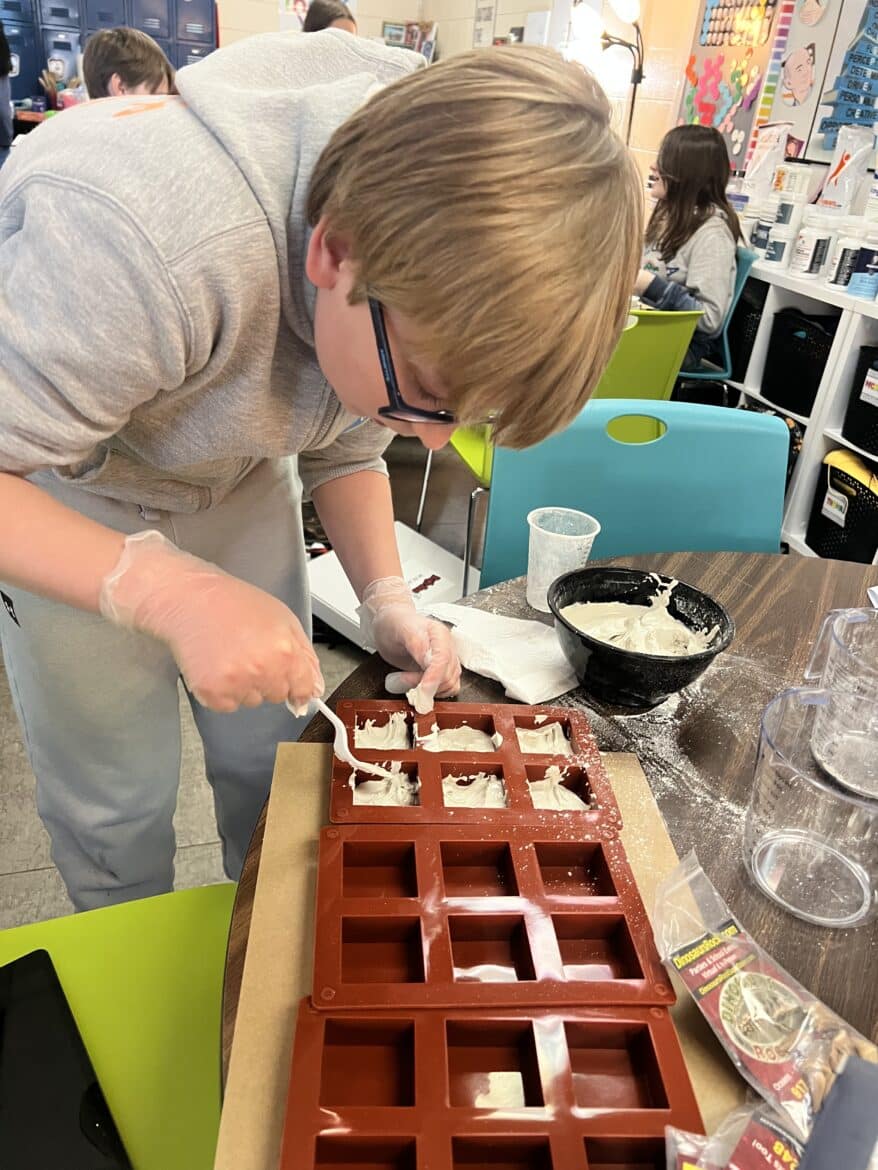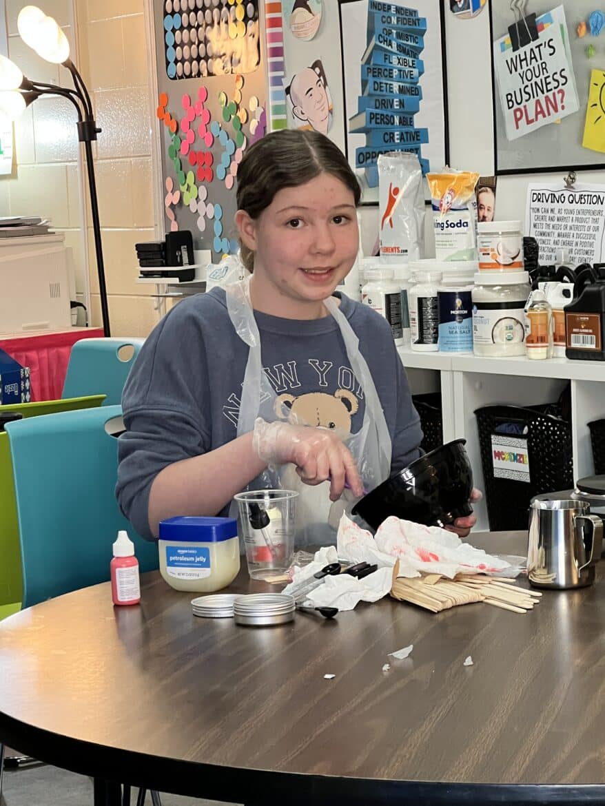 “To support this work, our classroom was transformed into a flexible, workshop-style space,” said Sarah Porter, gifted specialist at Millbrook Middle School. “Students could work in ways that fit their projects. Some needed outdoor areas for ventilation while making items like resin crafts, hydro-dipped products, or all-natural bug spray. Others worked indoors using heat presses, sublimation tools, or digital design programs to create candles, bath products, jewelry, tote bags, aprons, mouse pads, and 3D-designed games. At any given moment, the room reflected the diversity of their businesses and the authenticity of the experience.”