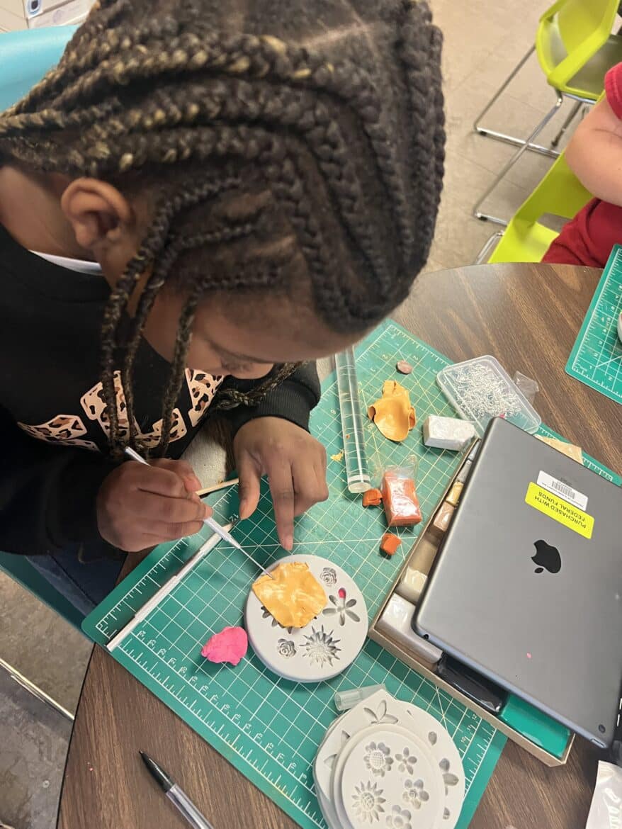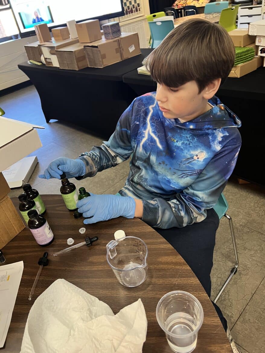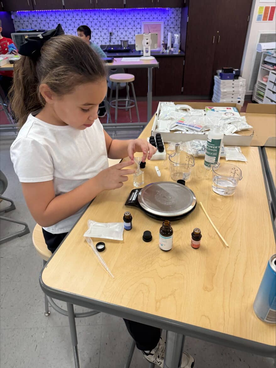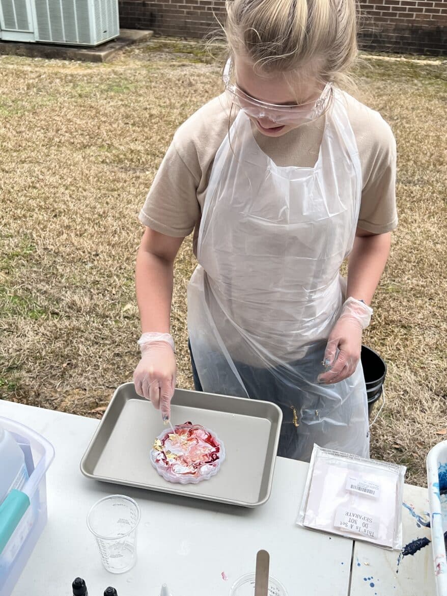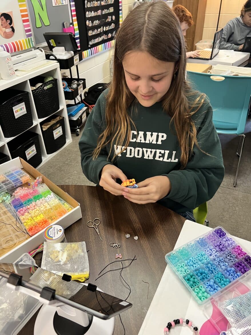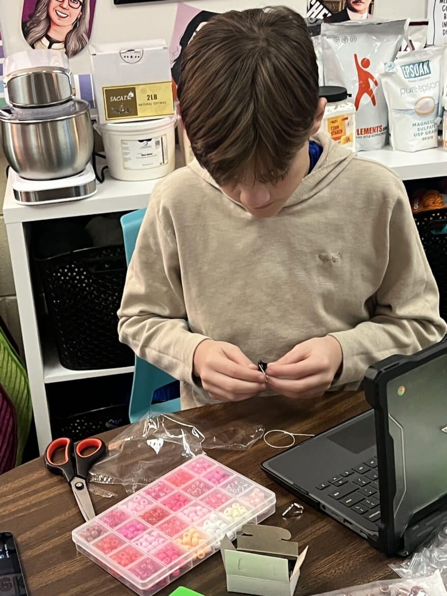 “To support this work, our classroom was transformed into a flexible, workshop-style space,” said Sarah Porter, gifted specialist at Millbrook Middle School. “Students could work in ways that fit their projects. Some needed outdoor areas for ventilation while making items like resin crafts, hydro-dipped products, or all-natural bug spray. Others worked indoors using heat presses, sublimation tools, or digital design programs to create candles, bath products, jewelry, tote bags, aprons, mouse pads, and 3D-designed games. At any given moment, the room reflected the diversity of their businesses and the authenticity of the experience.”
