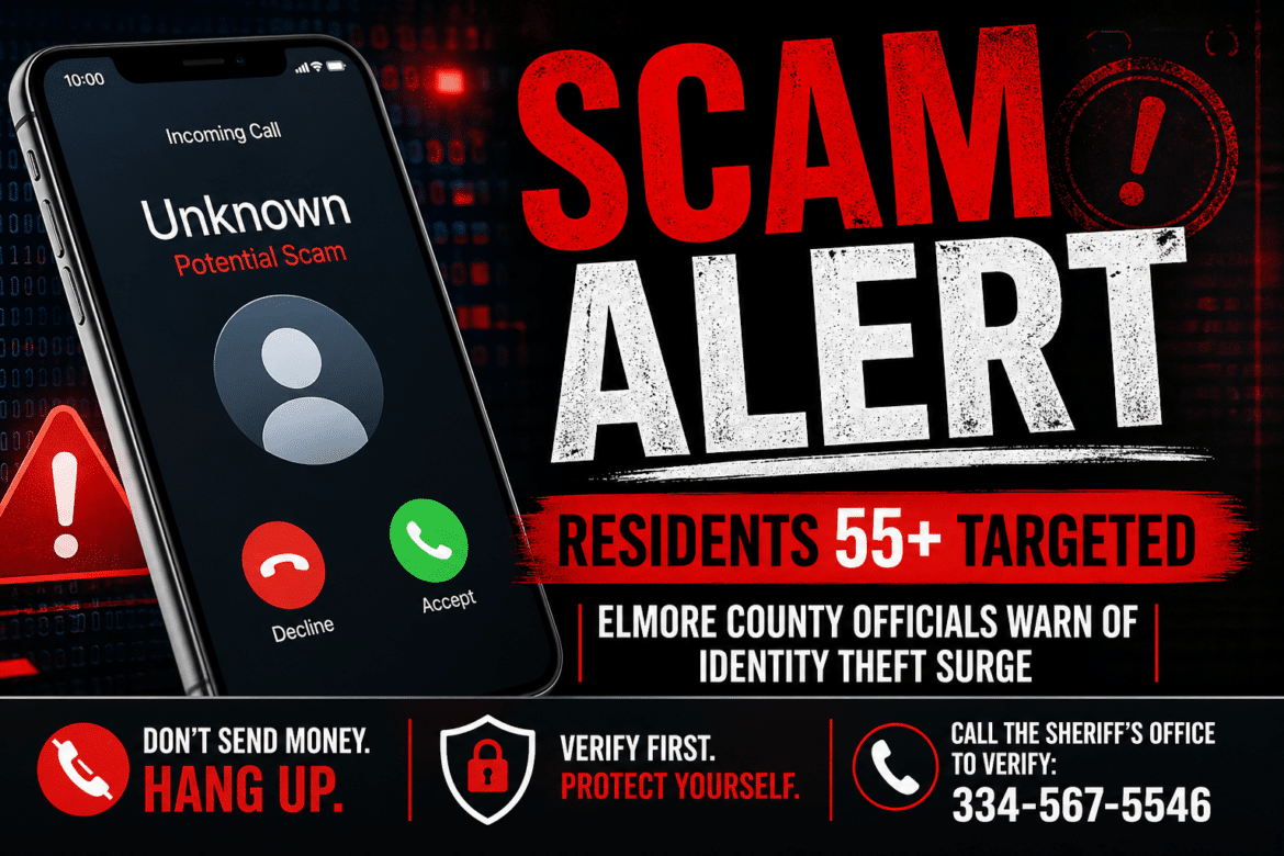 The Elmore County Sheriff’s Office will never call a citizen and ask for money. If you receive a phone call from someone claiming to be with law enforcement and are unsure if it’s legitimate, hang up and call the sheriff’s office at 334-567-5546.