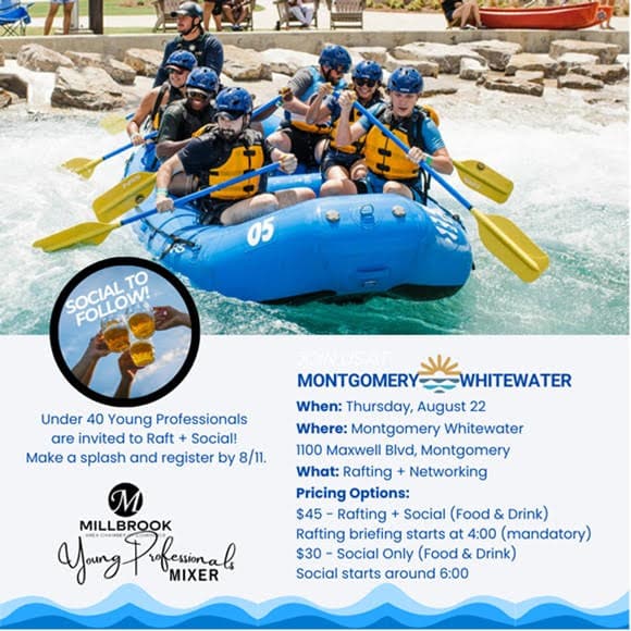 Registration for both the rafting and networking, and the social only will be open through August 11th. To register visit the Chamber website or visit, https://business.millbrookchamber.org/calendar/Details/macc-young-professionals-mixer-montgomery-whitewater-1160872?sourceTypeId=Hub